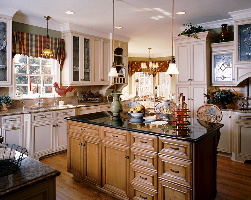 | The kitchen, which has a pass-through to the family room we see here, was featured in the annual 2005 Kitchen Ingredients Tour which benefits The Council for Children. I suggested a kitchen designer for the detail work and my client did a lot of the foot work looking at cabinets and granite. We had a wonderful time together making the final decisions on cabinet finishes, wall colors, fabrics and window treatments, and lighting and accessories. It was a great “team” effort and we had a lot of fun. |