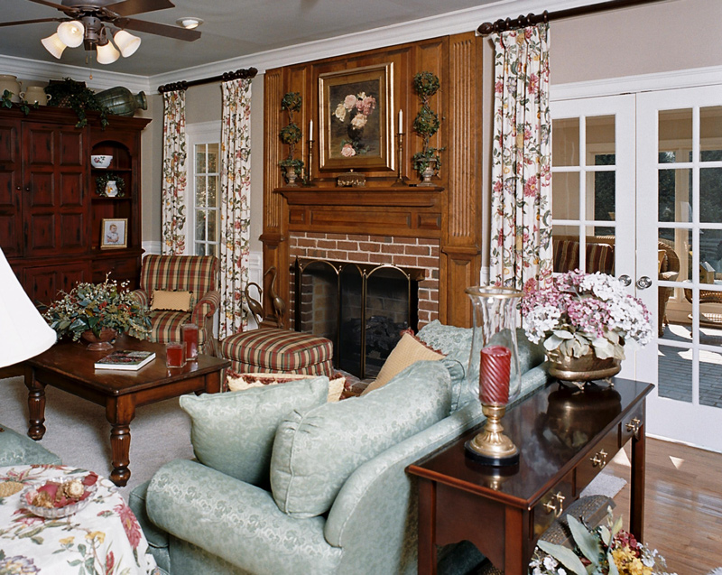 There is a window hiding behind the large red entertainment center you see in this picture! The unit had been especially designed for this client’s previous home that I did and the search for a larger house included finding a spot just right for this piece. My suggestion to the client and remodeler that we place it in front of the existing window on this wall and add a window to the left of the fireplace gave the room the balance that it previously lacked. |